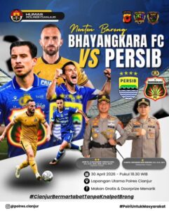 JAWA BARAT //propamnewstv.id/– Dalam rangka mempererat kebersamaan dengan masyarakat sekaligus menghadirkan hiburan positif bagi pecinta sepak bola, Polres Cianjur akan menggelar kegiatan nonton bareng (nobar) pertandingan antara Bhayangkara FC melawan Persib Bandung.