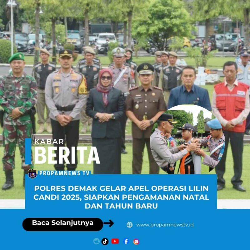 Demak // propamnewstv.id – Kepolisian Resor (Polres) Demak, Jawa Tengah, menggelar Apel Gelar Pasukan Operasi Lilin Candi 2025 di Halaman Sekretariat Daerah Kabupaten Demak, Jumat (19/12/2025). Apel dipimpin langsung oleh Bupati Demak dr. Eisti’anah sebagai bentuk kesiapan pengamanan perayaan Natal 2025 dan Tahun Baru 2026.