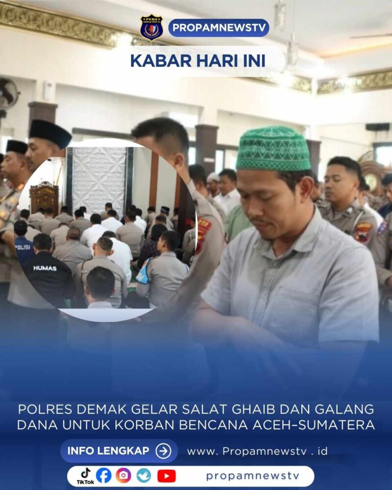 Demak // propamnewstv.id – Polres Demak menggelar salat ghaib untuk para korban bencana alam di Aceh dan Sumatra, Kamis (4/12/2025). Kegiatan yang berlangsung di Masjid Uswatun Hasanah Polres Demak ini diikuti oleh ratusan personel dari berbagai satuan fungsi. Suasana khidmat terasa sejak para anggota mulai memasuki masjid untuk melaksanakan ibadah salat dzuhur berjamaah, dilanjutkan do’a bersama untuk para korban bencana alam di wilayah Indonesia.