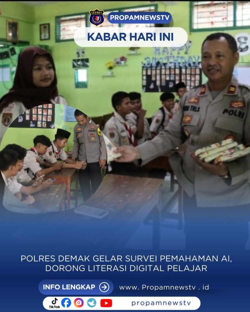Demak // propamnewstv.id – Polres Demak melaksanakan kegiatan survei pemahaman Artificial Intelligence (AI) kepada siswa SMA sederajat di Kabupaten Demak. Program ini merupakan tindak lanjut dari atensi Kapolda Jawa Tengah yang menekankan pentingnya edukasi terkait perkembangan teknologi serta pencegahan potensi penyalahgunaan AI di masa depan.