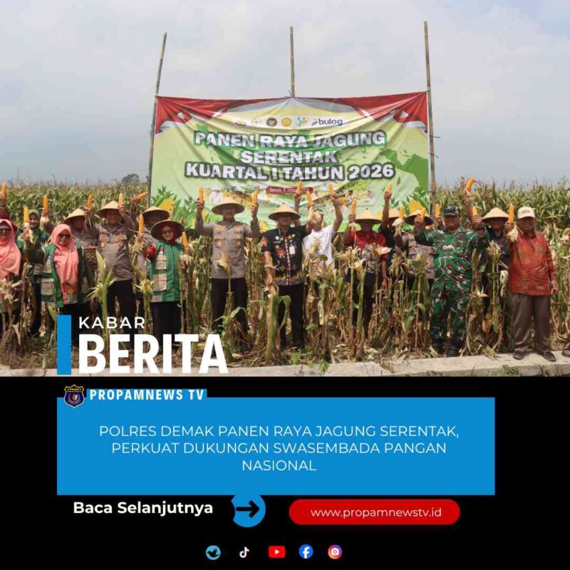 Demak //propamnewstv.id – Polres Demak melaksanakan kegiatan Panen Raya Jagung Serentak Kuartal I Tahun 2026 sebagai bentuk dukungan terhadap Program Swasembada Pangan Nasional. Kegiatan tersebut dipimpin langsung oleh Kapolres Demak AKBP Ari Cahya Nugraha di Desa Sumberejo, Kecamatan Mranggen, Kamis (8/1/2026).