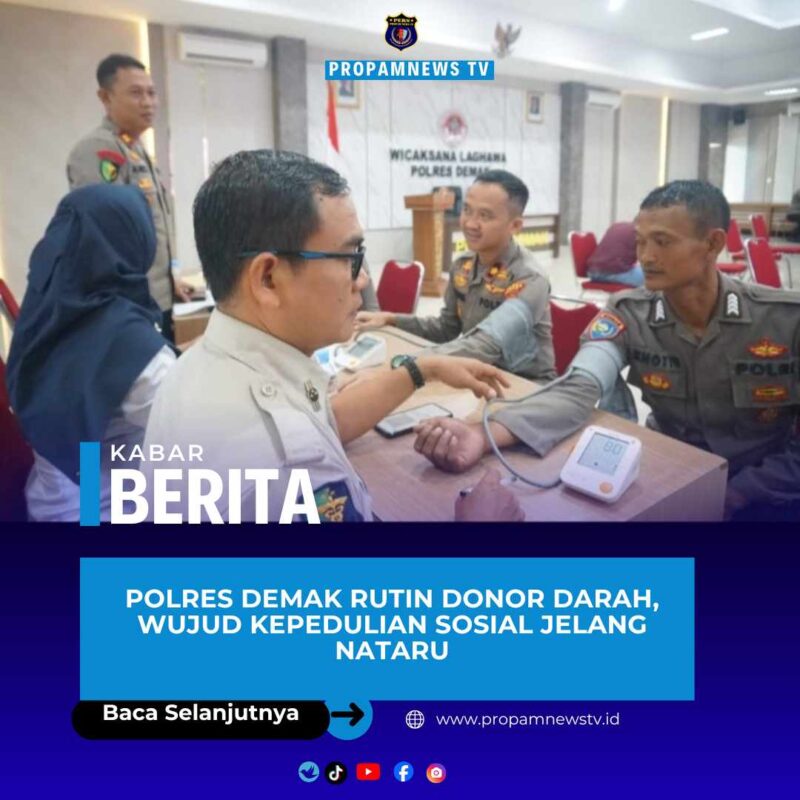 Demak // propamnewstv.id – Dalam rangka persiapan Operasi Lilin Candi 2025, Kepolisian Resor (Polres) Demak menggelar kegiatan bakti sosial donor darah yang berlangsung di Aula Wicaksana Laghawa, Senin (15/12/2025). Kegiatan kemanusiaan ini menjadi salah satu bentuk kepedulian Polri dalam membantu masyarakat, khususnya dalam pemenuhan kebutuhan stok darah di wilayah Kabupaten Demak.