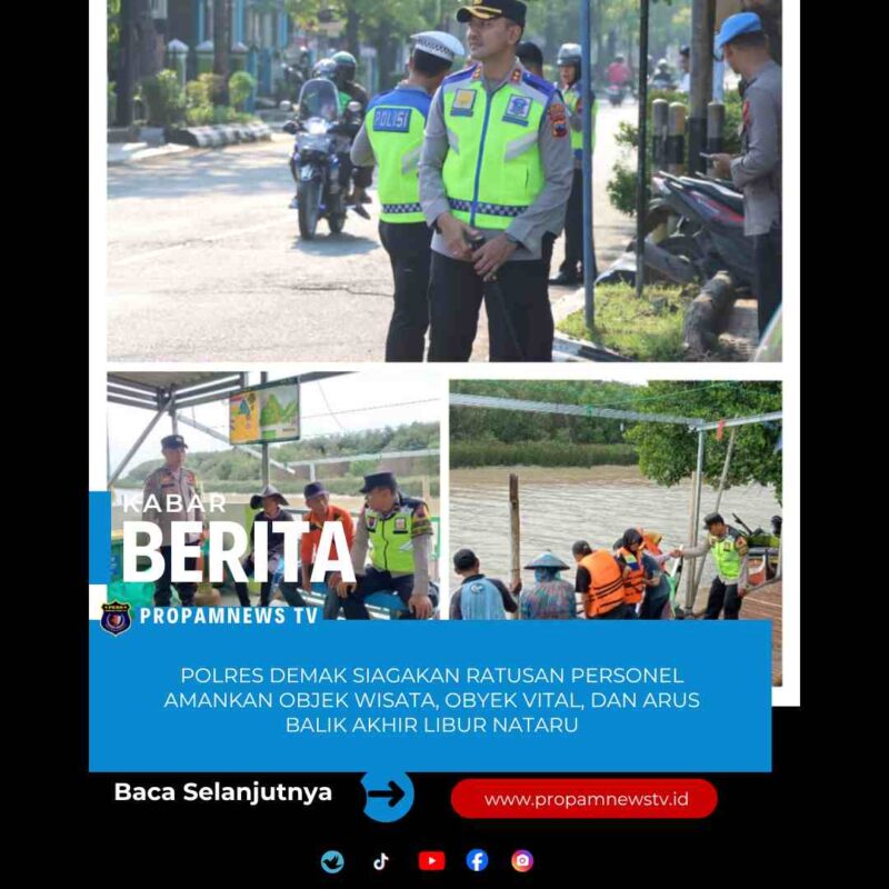 Demak // PropamNewstv.id – Kepolisian Resor (Polres) Demak menyiagakan ratusan personel di sejumlah objek wisata, obyek vital, serta titik-titik rawan ketersendatan arus lalu lintas di wilayah Kabupaten Demak. Langkah tersebut dilakukan untuk memberikan rasa aman dan nyaman kepada masyarakat pada hari terakhir libur Natal dan Tahun Baru (Nataru).