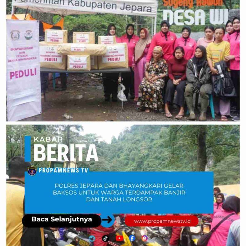 Jepara, // ProPamNewstv.id – Polres Jepara. Kepala Kepolisian Resor (Kapolres) Jepara AKBP Hadi Kristanto bersama Ketua Bhayangkari Cabang Jepara Ny. Dian Hadi Kristanto didampingi pejabat utama Polres Jepara dan pengurus Bhayangkari menggelar kegiatan bakti sosial dengan memberikan bantuan sosial kepada warga terdampak banjir dan tanah longsor di Desa Tempur, Kecamatan Keling, Kabupaten Jepara, pada Jumat (16/1/2026).