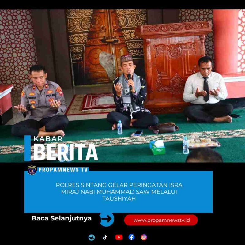 SINTANG, // PropamNewstv.id – Polres Sintang menggelar peringatan Isra Miraj Nabi Muhammad SAW yang diisi dengan kegiatan taushiyah oleh Ustadz Rohendi, S.Pd.I., M.A., yang diikuti oleh seluruh personel Polres Sintang, Selasa (20/1) Pagi.