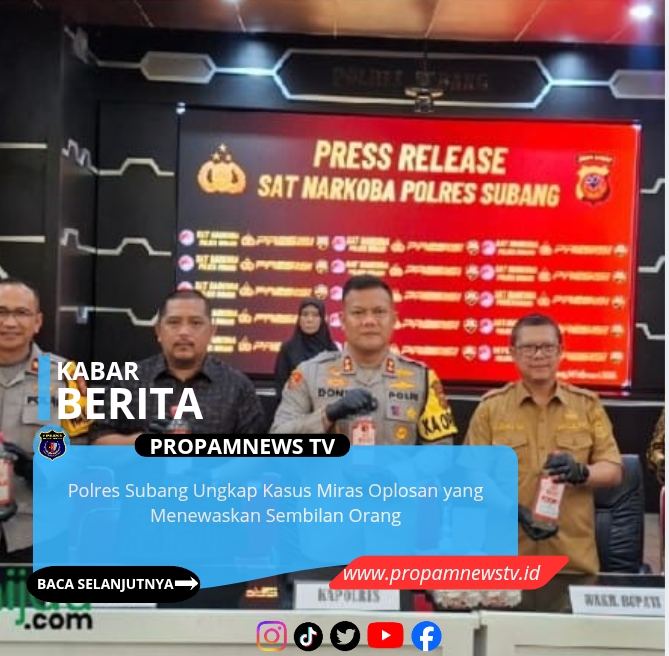 Subang, // PropamNewstv.id – 14 Februari 2026 — Polres Subang melalui Satuan Reserse Narkoba menggelar konferensi pers terkait pengungkapan kasus tindak pidana penyalahgunaan dan peredaran minuman beralkohol (miras) ilegal serta oplosan yang mengakibatkan sembilan orang meninggal dunia. Kegiatan ini berlangsung di Aula Patriatama Polres Subang, Sabtu (14/2/2026).