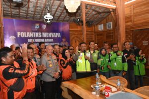 Id-/Suasana penuh keakraban mewarnai kegiatan “Polri Menyapa Ojek Online Banua” yang digelar di La Tare Joglo Resto Cafe n Gallery, Guntung Manggis, Kecamatan Landasan Ulin, Kota Banjarbaru, Rabu (7/4/2026). Acara yang dimulai pukul 14.30 WITA ini dihadiri langsung oleh Kakorlantas Polri Irjen Pol Drs. Agus Suryonugroho, S.H., M.Hum., dan Kapolda Kalimantan Selatan Irjen Pol Dr. Rosyanto Yudha Hermawan, S.I.K., S.H., M.H., bersama Dir Kamsel Koorlantas Polri Brigjen Pol Prianto, S.I.K., M.Si., Wakapolda Kalsel, Pejabat Utama Polda Kalsel, para koordinator lapangan komunitas ojek online (ojol) seperti Gojek, Shopee, Maxim, dan lainnya.