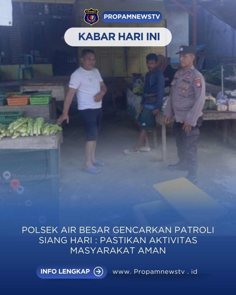 AIR BESAR, LANDAK // propamnewstv.id – Personel Polsek Air Besar melaksanakan patroli siang di sejumlah titik rawan untuk memastikan situasi kamtibmas tetap aman dan kondusif. Kegiatan patroli ini menyasar area pemukiman, pertokoan, jalur transportasi, serta lokasi-lokasi yang berpotensi menjadi titik kerawanan, Senin (1/12/2025).