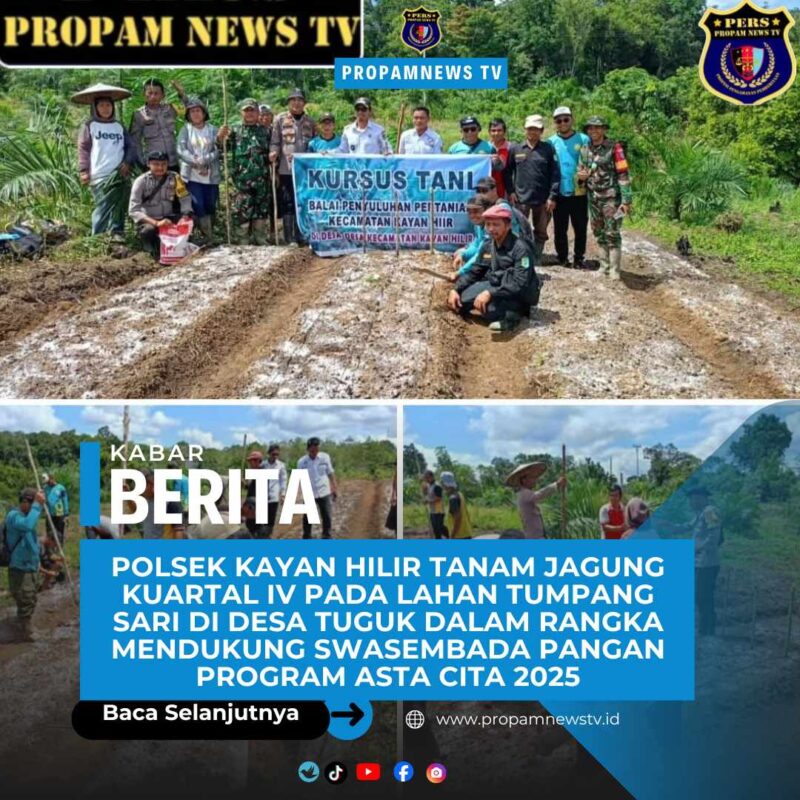 Sintang Kalbar//Propomnewstv.id — Polsek Kayan Hilir kembali menunjukkan komitmennya dalam mendukung ketahanan pangan daerah dengan melaksanakan kegiatan penanaman jagung Kuartal IV pada lahan tumpang sari di Desa Tuguk, Kecamatan Kayan Hilir. Kegiatan ini berlangsung di area perkebunan masyarakat yang telah disiapkan sebagai lahan produktif guna mendukung program nasional Swasembada Pangan melalui Asta Cita Tahun 2025, Rabu (10/12/2025).