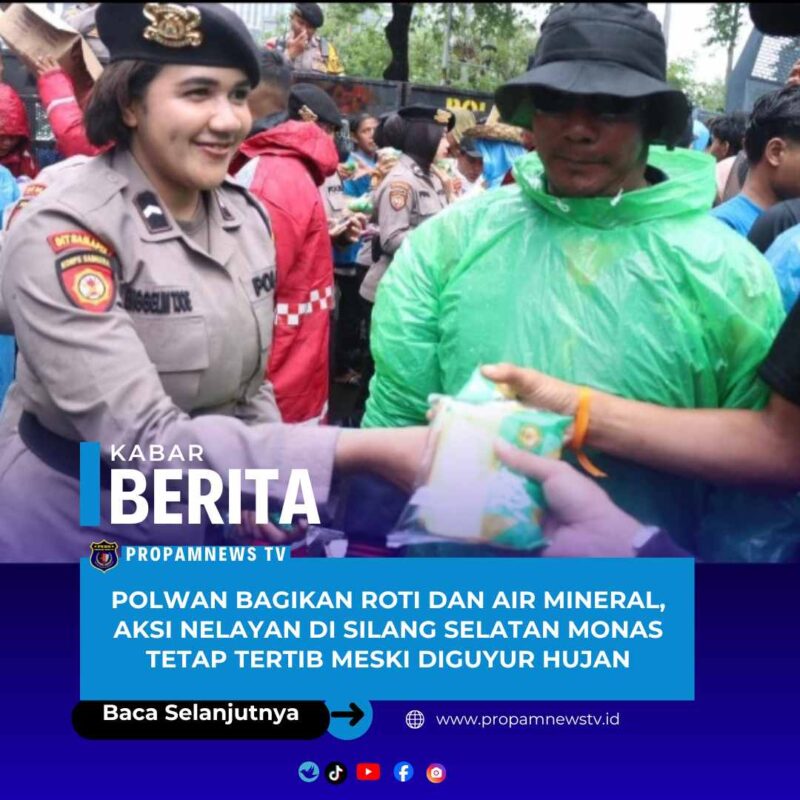 Di tengah hujan, Polwan bersama petugas kepolisian lainnya terlihat membagikan roti dan air mineral kepada para peserta unjuk rasa. Langkah tersebut menjadi wujud pelayanan humanis Polri kepada masyarakat yang tengah menyampaikan aspirasi secara terbuka.