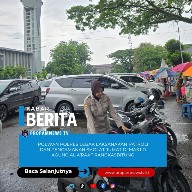 Lebak, // PropamNewstv.id – Dalam rangka memberikan rasa aman dan nyaman kepada masyarakat, jajaran Polisi Wanita (Polwan) Polres Lebak Polda Banten melaksanakan kegiatan pemberian imbauan kamtibmas serta patroli dan pengamanan (PAM) Sholat Jumat di Masjid Agung Al A’raaf, Kecamatan Rangkasbitung, Kabupaten Lebak, Jumat (23/1/2026).
