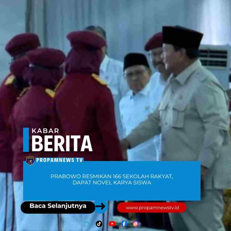 Jakarta, // PropamNewstv.id – Presiden Prabowo Subianto hari ini meresmikan 166 Sekolah Rakyat hari ini, Senin (12/1/2026). Peresmian ini berpusat di Sekolah Rakyat terpadu (SRT) 9 Banjarbaru yang ada di lingkungan Balai Besar Pendidikan dan Pelatihan Kesejahteraan Sosial (BBPPKS) di Banjarbaru, Kalimantan Selatan.
