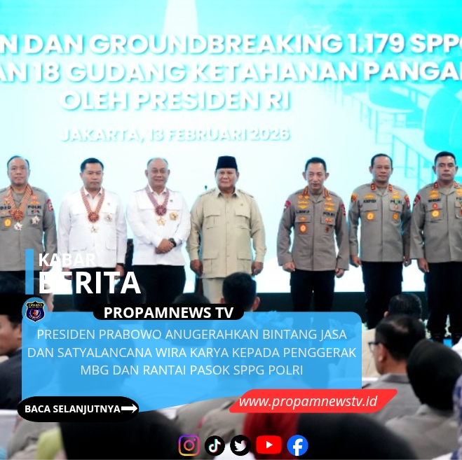 Jakarta, // PropamNewstv.id – Presiden Republik Indonesia, Prabowo Subianto, menganugerahkan tanda kehormatan Bintang Jasa dan Satyalancana Wira Karya kepada para pejabat Polri serta tokoh masyarakat yang menjadi penggerak Program Makan Bergizi Gratis (MBG) dan penguat rantai pasok Satuan Pelayanan Pemenuhan Gizi (SPPG) Polri dalam mendukung ketahanan pangan nasional.