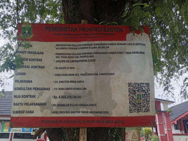 Pandeglang//propamnewstv.id — Proyek Peningkatan Kualitas Pemukiman Kumuh Paket 1 di Desa Pagelaran, Kecamatan Pagelaran, Kabupaten Pandeglang, Provinsi Banten, kembali menuai sorotan tajam. Proyek yang dikerjakan oleh CV Karaton Mega Karya dengan nilai kontrak Rp 4.055.378.136 tersebut didanai melalui APBD Provinsi Banten Tahun Anggaran 2025.