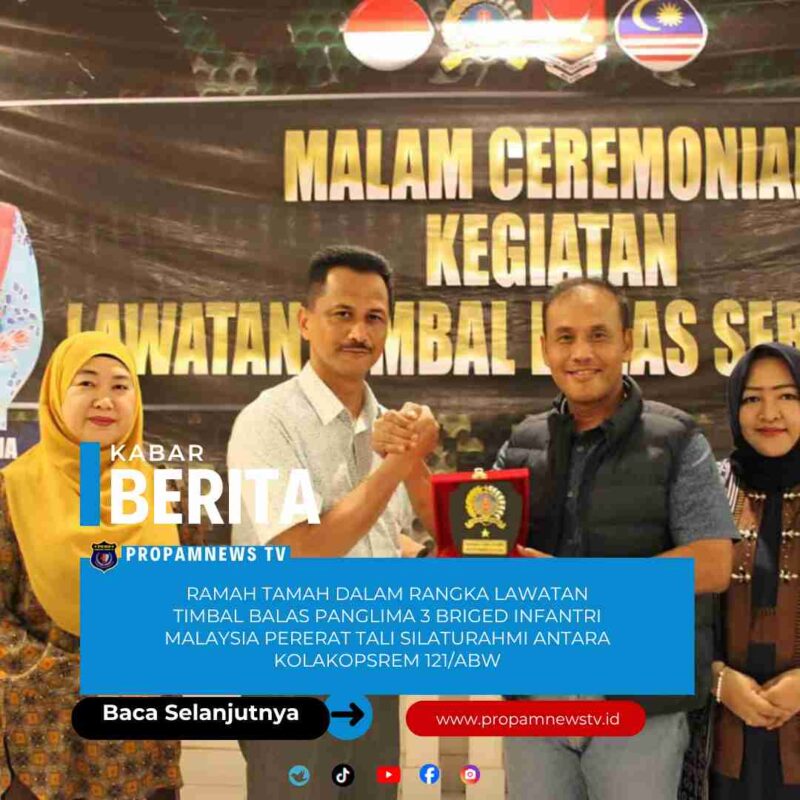 PONTIANAK //propamnewstv.id – Dalam rangka Lawatan Timbal Balas 3 Briged Infantri Malaysia, Danrem 121/Abw Brigjen TNI Purnomosidi, S.I.P., M.A.P., M.Han., selaku Dankolakopsrem 121/Abw gelar ramah tamah bersama Panglima 3 Briged Brigjen Khairudin bin Zakaria beserta para pejabat Delegasi MK 3 Briged Infantri Malaysia, bertempat di Pondok Kakap, Pontianak, Kalimantan Barat, Minggu (28/12/2025) malam.