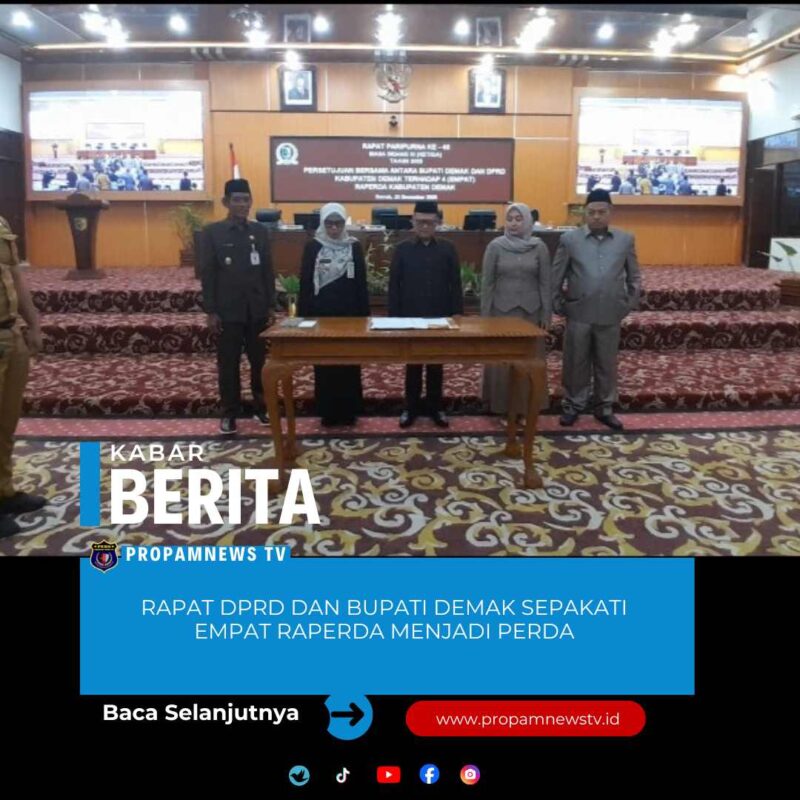 Demak //propamnewstv.id , Dewan Perwakilan Rakyat Daerah (DPRD) Kabupaten Demak bersama Bupati Demak secara resmi menyepakati empat Rancangan Peraturan Daerah (Raperda) untuk ditetapkan menjadi Peraturan Daerah (Perda). Persetujuan tersebut diambil dalam rapat paripurna bertajuk Persetujuan Bersama DPRD dan Bupati terhadap Empat Rancangan Peraturan Daerah Kabupaten Demak yang digelar di ruang rapat paripurna DPRD Demak, Jawa Tengah, Selasa (23/12/2025).