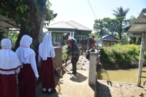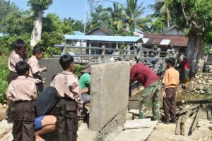Terlihat di lapangan, anggota TNI bersama masyarakat bahu-membahu menyelesaikan pekerjaan konstruksi, mulai dari pemasangan rangka hingga pengecoran bagian penyangga jembatan. Semangat gotong royong menjadi kunci utama dalam percepatan pembangunan infrastruktur tersebut.