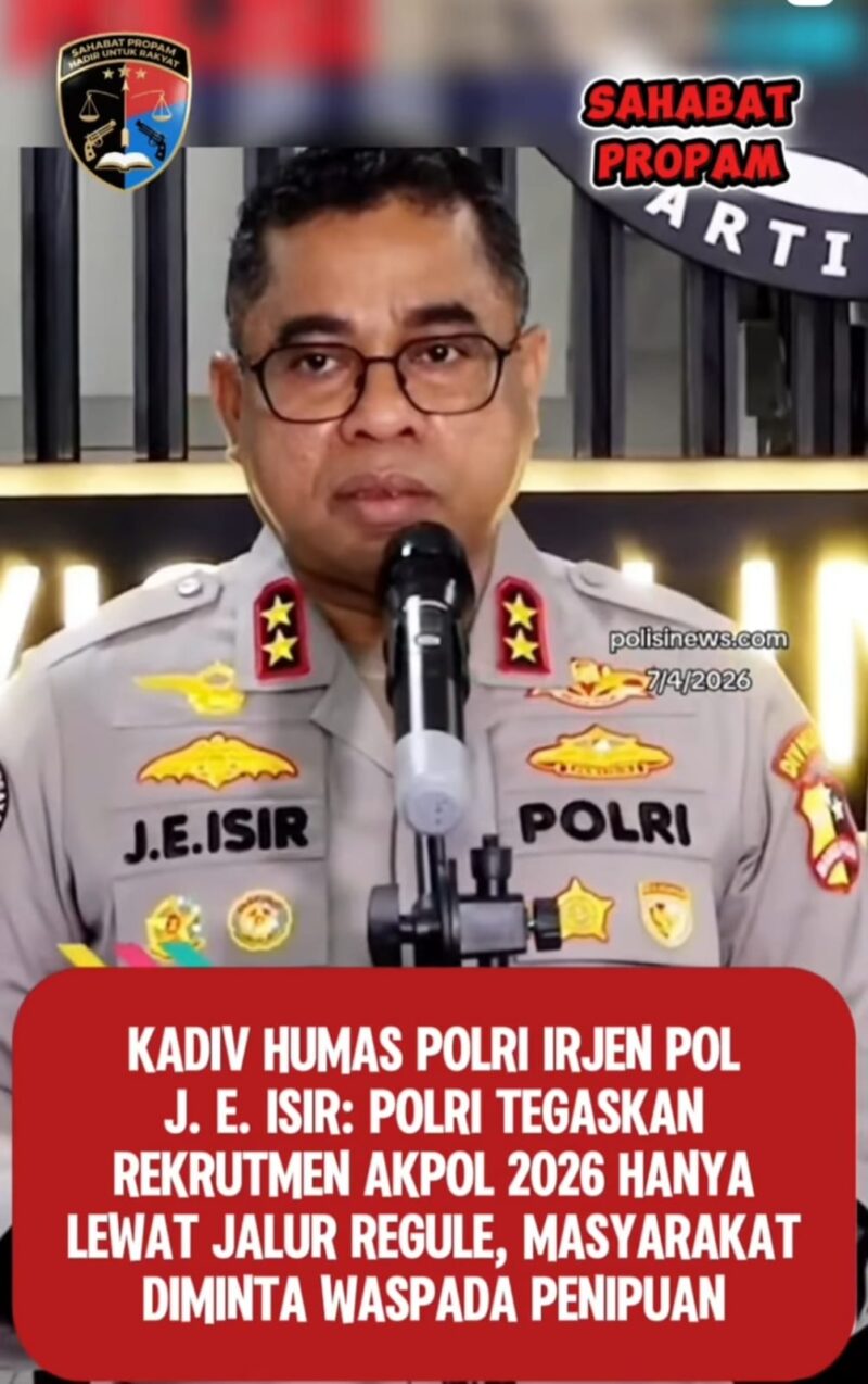 JAKARTA,//PropamNewsTv.id/—Kepolisian Negara Republik Indonesia kembali menegaskan komitmennya dalam menjaga proses rekrutmen yang bersih, transparan, dan akuntabel. Melalui pernyataan resmi, Kadiv Humas Polri Irjen Pol. J. E. Isir menegaskan bahwa penerimaan Taruna dan Taruni Akademi Kepolisian (Akpol) Tahun Anggaran 2026 hanya dilakukan melalui jalur seleksi reguler tanpa adanya kuota khusus.