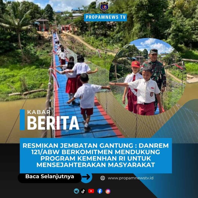 SANGGAU // propamnewstv.id – Dankolakopsrem 121/Abw Brigjen TNI Purnomosidi, S.I.P., M.A.P., M.Han., meresmikan Jembatan Gantung Desa Kampung Sungai Sekayam yang terletak di Dusun Mangkau, Entikong, Sanggau, Kalimantan Barat. Sabtu, (13/12/2025).