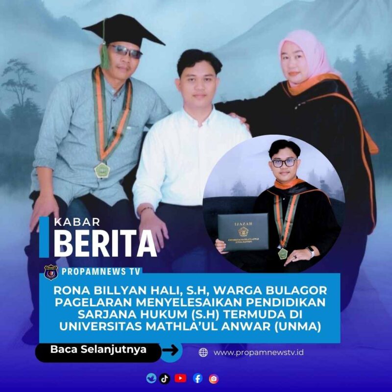 Salah satu mahasiswa Termuda bernama RONA BILLYAN HALI, S.H, 21 Tahun anak dari Rusdik gustian (ayah) dan Husnawati (ibu) warga Pandeglang bertempat tinggal di Bulagor Pagelaran telah menyelesaikan pendidikan Sarjana Hukum (S.H) Termuda di Universitas Mathla’ul Anwar (UNMA) Banten atas Wisuda Sarjana dan Magister ke-33 di Gedung Serbaguna K.H. Muhammad Irsjad Djuwaeli.