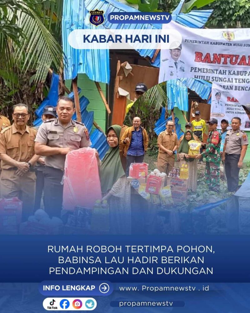 HULU SUNGAI TENGAH//propamnewstv.id – Babinsa Koramil 1002-08/Labuan Amas Utara (LAU) Sertu Agus Arahman melaksanakan pendampingan penyaluran bantuan dari Pemerintah Kabupaten Hulu Sungai Tengah (HST) kepada warga yang mengalami musibah rumah roboh akibat tertimpa pohon di Desa Kasarangan, Senin (02/12/2025).