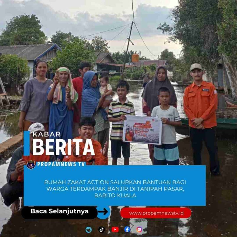 Barito Kuala, // PropamNewstv.id — Rumah Zakat Action Kalimantan Selatan merespons bencana banjir yang melanda Desa Tanipah Pasar, Kecamatan Mandastana, Kabupaten Barito Kuala, Kalimantan Selatan. Banjir dipicu oleh hujan deras yang mengguyur wilayah tersebut sejak malam hingga pagi hari, sehingga menyebabkan meningkatnya debit air sungai serta kiriman air dari wilayah hulu.