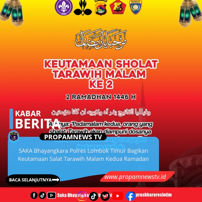 LOMBOK, // PropamNewstv.id – 19 Februari 2026 — Sekretariat Saka Bhayangkara Polres Lombok Timur membagikan informasi mengenai keutamaan salat Tarawih malam kedua Ramadan 1447 Hijriah sebagai bagian dari kegiatan edukasi ibadah kepada masyarakat.