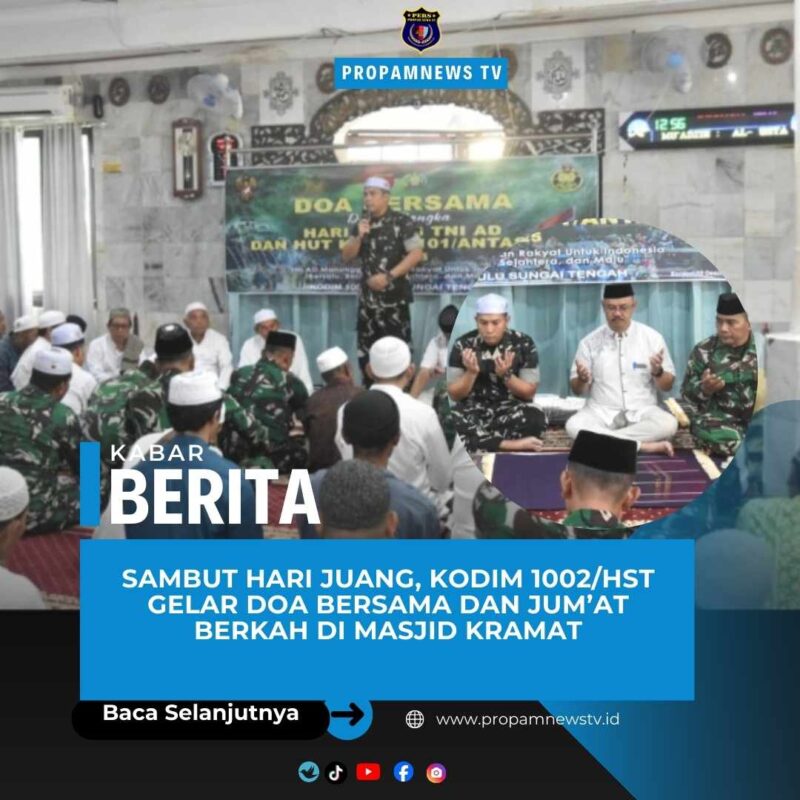 BARABAI // propamnewstv.id — Menyongsong peringatan Hari Juang TNI AD ke-80 dan Hari Ulang Tahun Korem 101/Antasari pada 15 Desember 2025, prajurit Kodim 1002/Hulu Sungai Tengah (HST) melaksanakan Doa Bersama di Masjid Kramat Desa Pelajau, Kecamatan Pandawan, Kabupaten HST, Jumat (12/12/25).