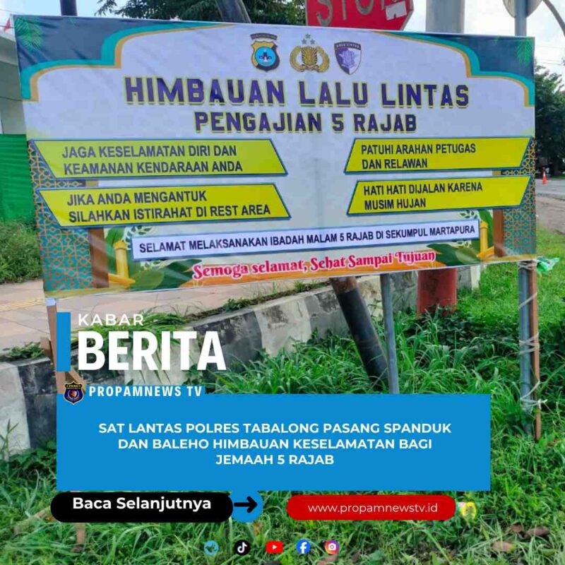 Tabalong //propamnewstv.id – Dalam rangka mendukung kelancaran dan keselamatan perjalanan jemaah yang akan menghadiri peringatan 5 Rajab 1447 Hijriah di Sekumpul, Martapura, Kabupaten Banjar, Satuan Lalu Lintas Polres Tabalong melaksanakan pemasangan spanduk dan baleho himbauan keselamatan lalu lintas, Jumat (26/12/2025).