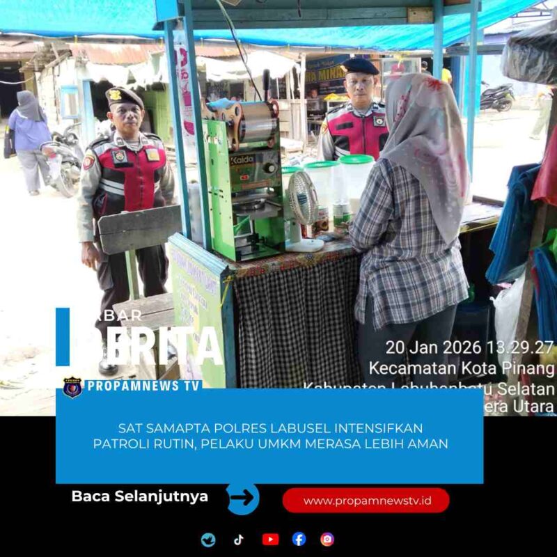 Labuhanbatu Selatan //propamnewstv.id – Guna menjaga situasi keamanan dan ketertiban masyarakat (harkamtibmas), Satuan Samapta Polres Labuhanbatu Selatan melaksanakan patroli rutin dan patroli Samapta pada Selasa (20/1/2026) sekitar pukul 14.00 WIB hingga selesai. Patroli ini difokuskan untuk mencegah terjadinya tindak pidana serta pelanggaran 3C (Curat, Curas, dan Curanmor) di wilayah hukum Polres Labuhanbatu Selatan.