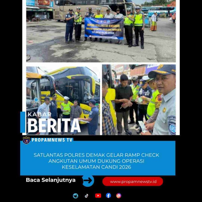 Demak, // PropamNewstv.id – Satuan Lalu Lintas (Satlantas) Polres Demak bersama Jasa Raharja dan Dinas Perhubungan Kabupaten Demak menggelar inspeksi keselamatan kendaraan atau ramp check di Terminal Wisata Kadilangu, Kabupaten Demak, Rabu (4/2/2026). Kegiatan ini merupakan bagian dari rangkaian Operasi Keselamatan Candi 2026 yang berlangsung pada 2–15 Februari 2026.