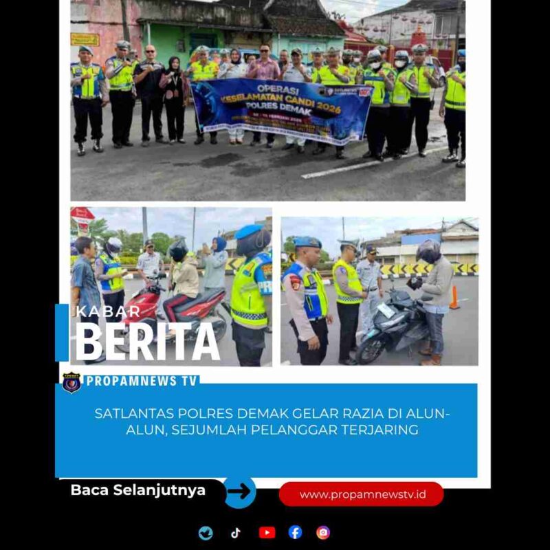Demak, // PropamNewstv.id – Satuan Lalu Lintas (Satlantas) Polres Demak bersama Unit Pelaksana Pendapatan Daerah (UPPD) Kabupaten Demak dan Jasa Raharja menggelar razia kendaraan bermotor di kawasan Alun-alun Demak, Selasa (3/2/2026). Kegiatan ini merupakan bagian dari pelaksanaan Operasi Keselamatan Candi 2026 yang digelar secara serentak di wilayah Jawa Tengah.