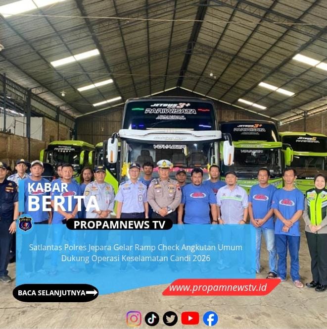 Jepara, // PropamNewstv.id – Polres Jepara Dalam rangka mendukung pelaksanaan Operasi Keselamatan Candi 2026, Kepolisian Resor (Polres) Jepara, Polda Jawa Tengah, melaksanakan kegiatan ramp check kelaikan jalan angkutan bus di Garasi Bus PO KJM Putra Sinanggul Kabupaten Jepara, pada Senin (9/2/2026).