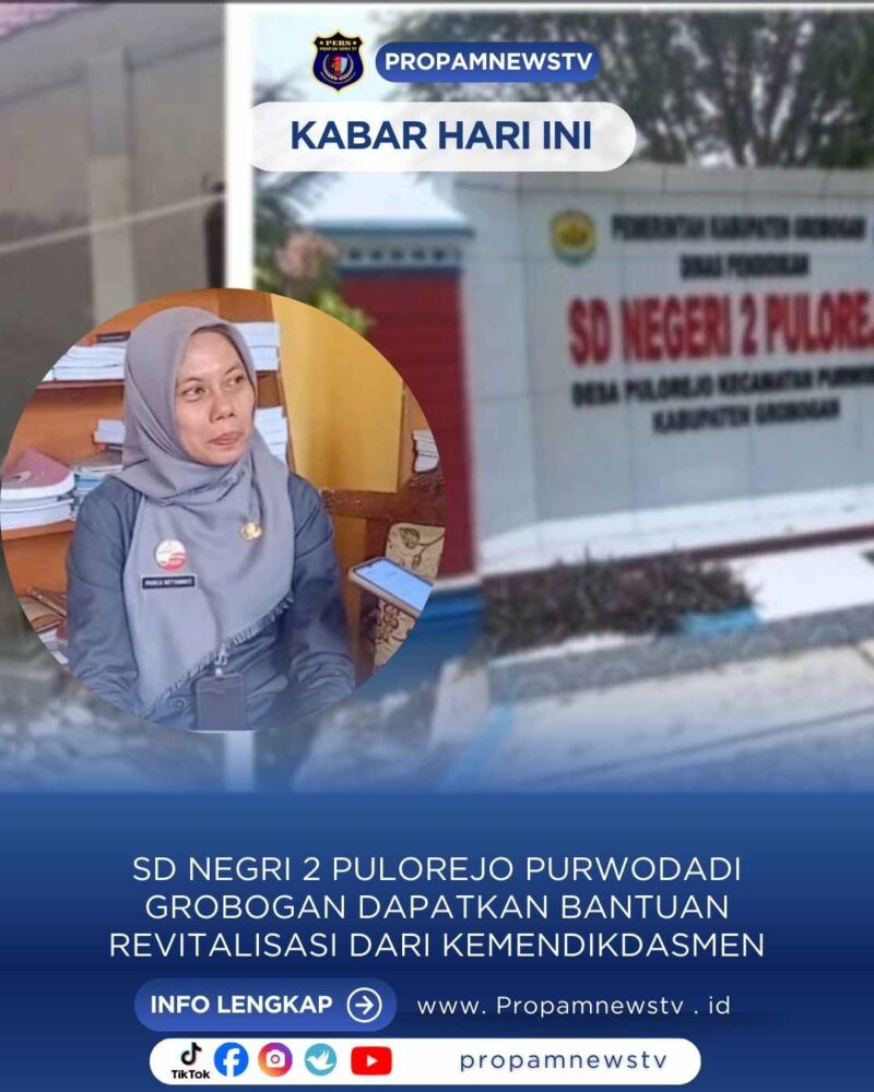 Grobogan 03/11/2025 // propamnewstv.id – SD Negeri 2 Pulorejo Kecamatan Purwodadi Kabupaten Grobogan Jawa Tengah resmi menerima Bantuan Program Revitalisasi Satuan Pendidikan dari Direktorat Jenderal Pendidikan Anak Usia Dini, Pendidikan Dasar dan Pendidikan Menengah (Kemendikdasmen). Bantuan pemerintah tahun anggaran 2025 tersebut dialokasikan untuk peningkatan sarana dan prasarana sekolah dengan total nilai Rp469.572.304 yang bersumber dari APBN 2025.