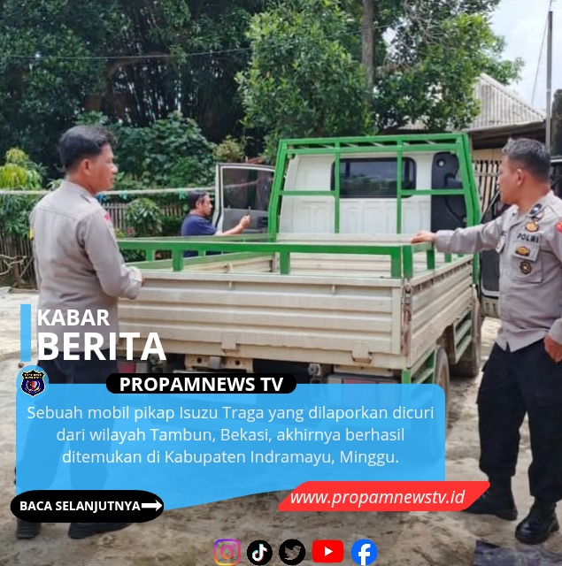 Sebuah mobil pikap Isuzu Traga yang dilaporkan dicuri dari wilayah Tambun, Bekasi, akhirnya berhasil ditemukan di Kabupaten Indramayu, Minggu.