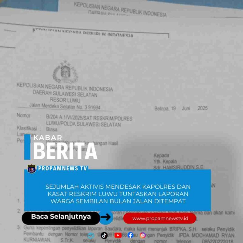 Luwu, // PropamNewstv.id – Presiden Koalisi LSM dan Pers Sulsel Mulyadi S.H dan Sejumlah Aktivis Mendesak Kapolres Luwu agar segera menindaklanjuti atau meproses kembali sejumlah kasus atau laporan masyarakat sejak tahun 2025 hingga tahun 2026 belum ada titik terang.