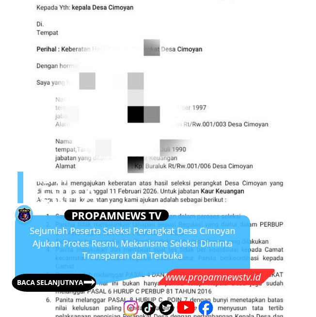 Pandeglang, // PropamNewstv.id  — Proses seleksi perangkat desa kembali menjadi sorotan. Kali ini, keberatan diajukan oleh dua peserta seleksi jabatan Kepala Urusan (Kaur) Keuangan di Desa Cimoyan, Kecamatan Patia, Kabupaten Pandeglang, Kamis (19/02/2026).