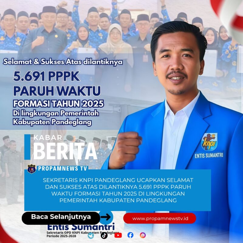 Pandeglang //propamnewstv.id – Sekretaris Dewan Pengurus Daerah Komite Nasional Pemuda Indonesia (KNPI) Kabupaten Pandeglang, Entis Sumantri, menyampaikan ucapan selamat dan sukses kepada 5.691 Pegawai Pemerintah dengan Perjanjian Kerja (PPPK) Paruh Waktu yang baru dilantik di lingkungan pemerintah Kabupaten Pandeglang, Selasa (23/12/2025).