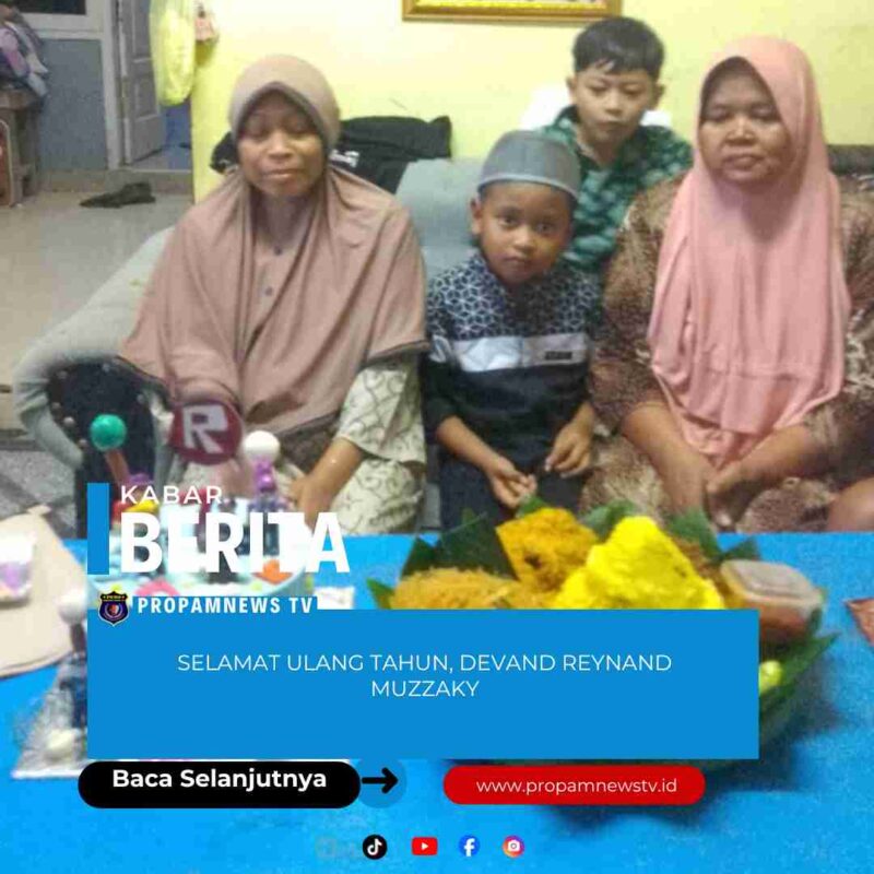// PropamNewstv.id – Hari ini adalah hari yang istimewa karena kita merayakan ulang tahun Devand Reynand Muzzaky yang ke-7 tahun. Meskipun ayahmu tidak bisa hadir karena sedang menjalankan tugas penting, kami semua di sini untuk merayakan hari bahagiamu ini.
