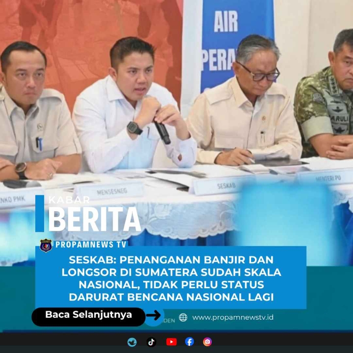 Jakarta // propamnewstv.id – Sekretaris Kabinet (Seskab) Letkol Teddy Indra Wijaya menanggapi aspirasi agar banjir dan longsor di tiga provinsi Sumatera diberikan status darurat bencana nasional. Menurut Teddy, pemerintah pusat sudah melakukan penanganan skala nasional di tiga provinsi tersebut sejak hari pertama bencana terjadi pada tanggal 26.