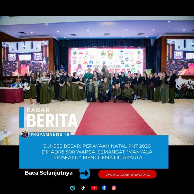 JAKARTA, 25 Januari 2026 //propamnewstv.id – Paimpuluan Ne Tonsea (PNT) sukses menggelar perayaan Natal 2025 dan Tahun Baru 2026 yang berlangsung meriah di Gedung Mutiara STIK – PTIK, Jakarta Selatan, Sabtu (24/1). Tercatat sebanyak 800-an warga Tonsea dari 55 perkumpulan Watasi di Jakarta dan sekitarnya memadati lokasi, membuktikan soliditas luar biasa masyarakat Tonsea di perantauan.