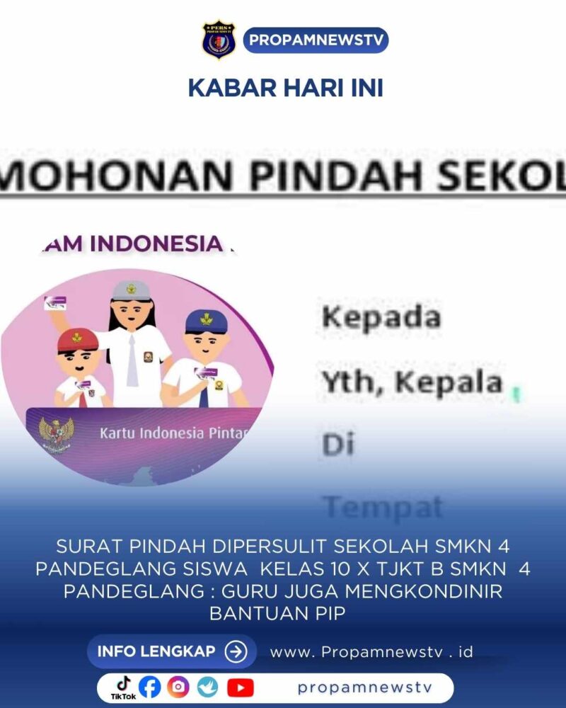 Pandeglang // Propamnewstv.id — Di Persulit dalam mengurus berkas surat pindah siswa bernama Imam Romdoni kelas 10 X TJKT B SMKN 4 Pandeglang kini tidak bisa sekolah dirinya sekarang hanya bisa mejalani keseharian nya di pondok pesantren yang tidak jauh dari kediaaman nya di kampung.