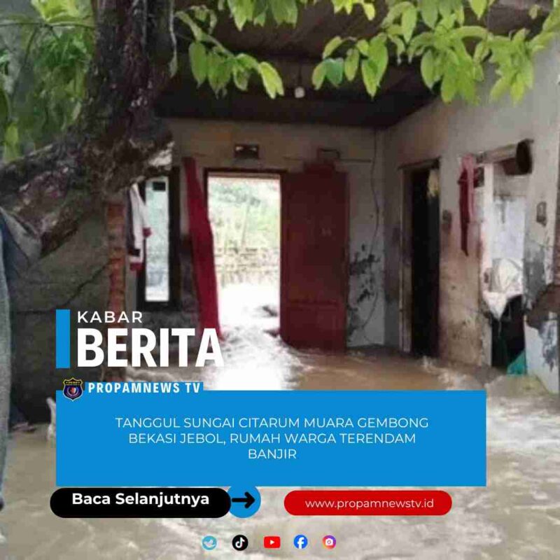 Bekasi, // PropamNewstv.id – Tanggul penahan aliran Sungai Citarum di Kampung Bendungan, RT 03/05, Desa Pantai Bakti, Kecamatan Muara Gembong, Kabupaten Bekasi, jebol. Akibatnya permukiman warga terendam.