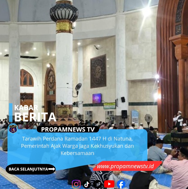 NATUNA, // PropamNewstv.id — Salat tarawih perdana Ramadan 1447 Hijriah/2026 Masehi digelar secara berjamaah di Masjid Baitul Izza, Rabu (18/2/2026) malam, usai salat isya. Kegiatan ini menandai dimulainya rangkaian ibadah bulan suci Ramadan di Kabupaten Natuna.