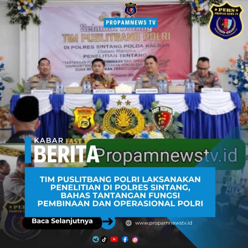 Sintang Kalbar/ Propomnewstv.id – Tim Pusat Penelitian dan Pengembangan Polri melaksanakan kegiatan penelitian bertajuk “Tantangan Fungsi Pembinaan dan Operasional Polri (Harkamtibmas, Penegakan Hukum, dan Pelayanan) Guna Mewujudkan Transformasi Polri” di Aula Langkau Kita Rumah Dinas Wakil Bupati Sintang, Kamis pagi (11/12/2025).