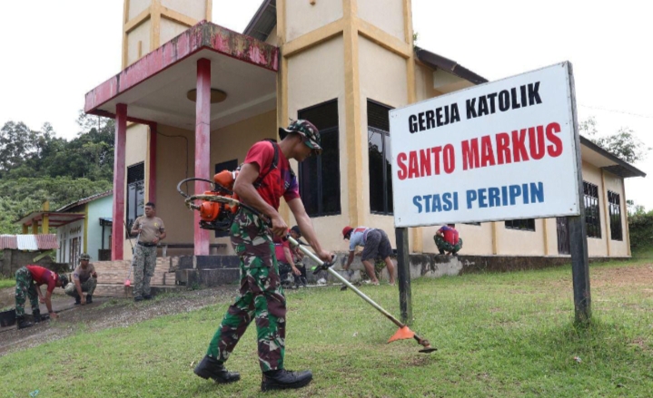 ENTIKONG // propamnewstv.id — Personel TNI, Tentera Diraja Malaysia (TDM) dan masyarakat setempat melaksanakan kegiatan karya bakti bersama di Gereja Katolik Santo Markus Stasi Peripin, sebagai wujud kepedulian dan pengabdian terhadap kebersihan serta kerapihan rumah ibadah di wilayah perbatasan. Kamis, ( 27/11/2025 )
