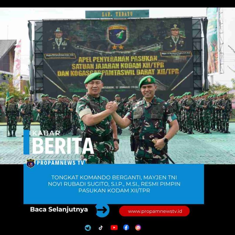 KUBU RAYA, // PropamNewstv.id – Pemegang Tongkat Komando untuk memimpin Kodam XII/Tanjungpura telah berganti. Mayjen TNI Novi Rubadi Sugito, S.I.P., M.Si., kini resmi memegang kendali penuh atas seluruh pasukan satuan jajaran dan Komando Satuan Tugas Gabungan Pengamanan Perbatasan Wilayah (Kogasgab Pamtaswil) Darat XII/Tpr.