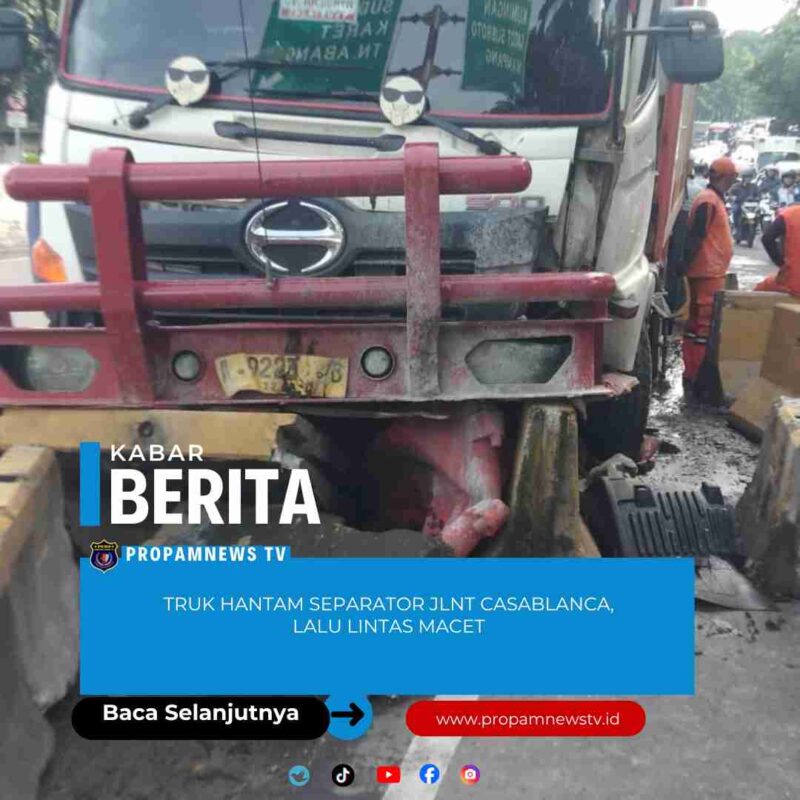 Jakarta, // PropamNewstv.id – Sebuah truk menabrak separator atau pembatas jalan jelang JLNT Casablanca, Tebet, Jakarta Selatan. Insiden tersebut sempat menyebabkan kepadatan lalu lintas di sekitar lokasi kejadian.