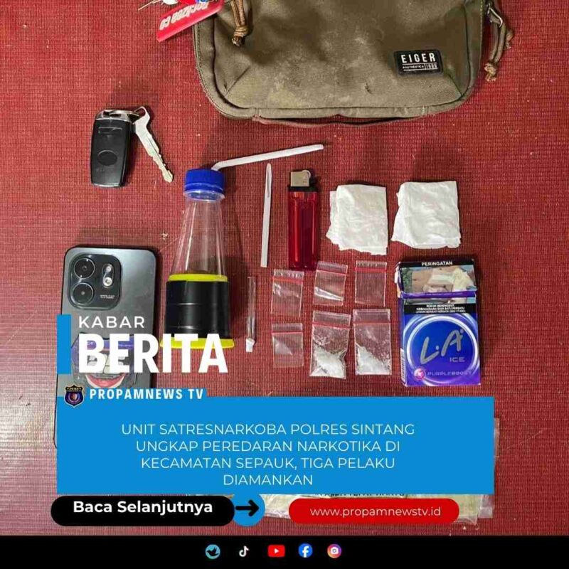 Sintang, // PropamNewstv.id – Unit Satuan Reserse Narkoba Polres Sintang berhasil mengungkap kasus peredaran narkotika di wilayah Kabupaten Sintang. Dalam pengungkapan tersebut, petugas kepolisian mengamankan tiga orang pelaku beserta sejumlah barang bukti yang diduga narkotika jenis sabu.
