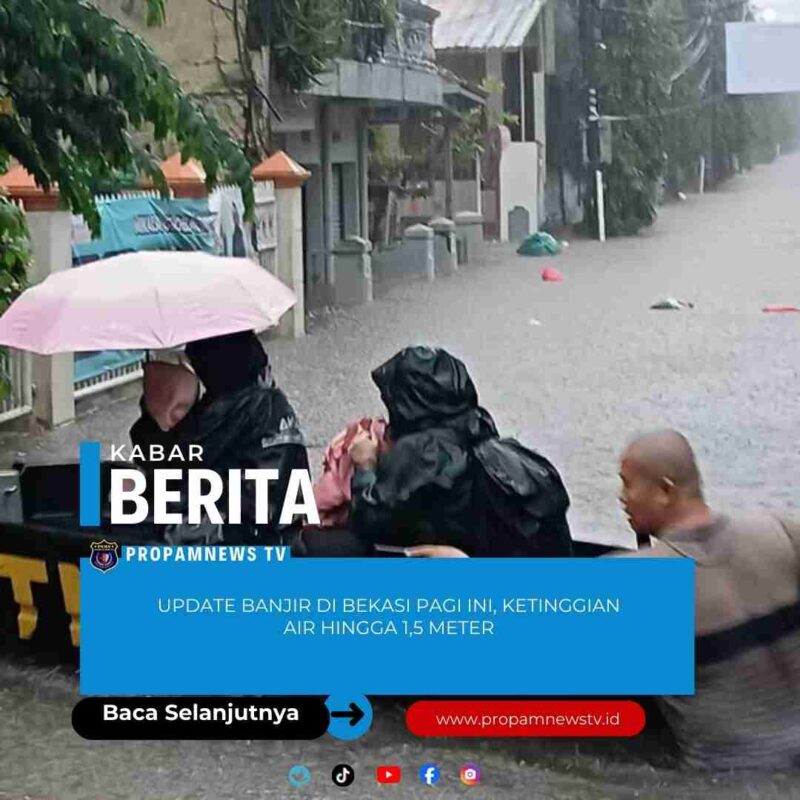 Jakarta, // PropamNewstv.id – Kota Bekasi dilanda banjir pagi ini. Ketinggian air bervariasi, salah satu titik ada yang melaporkan hingga 150 cm atau 1,5 meter.